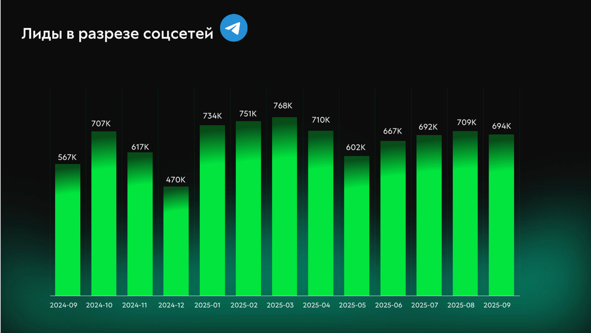 На фоне спада в привычных каналах продолжается рост роли альтернативных площадок: VK показал рост на 8%, а Telegram увеличил число лидов почти на 34% по сравнению с III кварталом 2024 года.