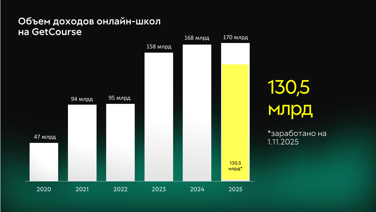 Сегмент небольших онлайн-школ, работающих на сторонних LMS, тоже показывает охлаждение. Так, по данным GetCourse, за десять месяцев 2024 года школы на платформе заработали 137,7 млрд рублей, а за тот же период 2025-го — 130,5 млрд (-5% год к году).