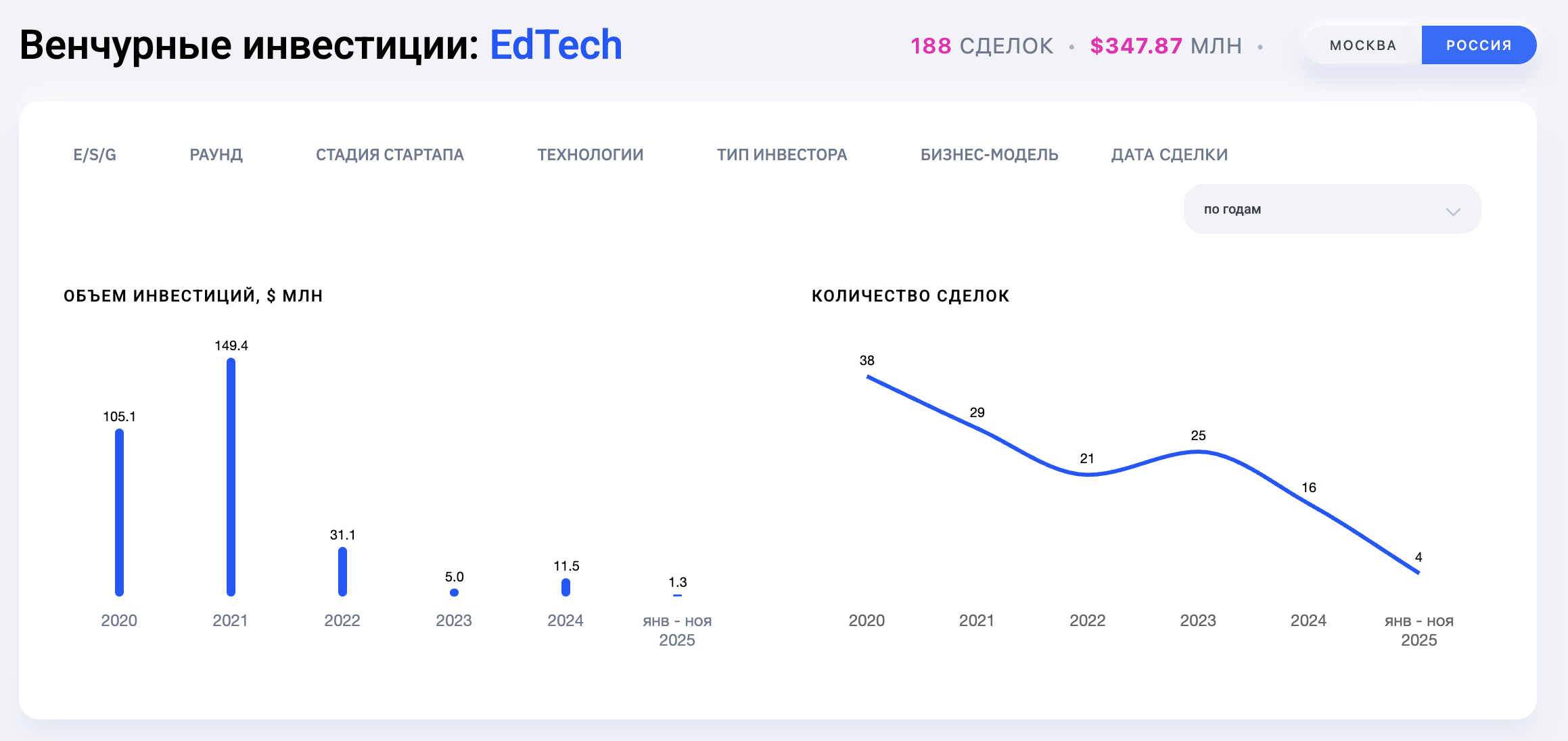 Рынок продолжает сталкиваться с сокращением финансирования: как в России, так и за рубежом. На российском рынке в 2025 году, по данным Venture Guide, состоялось 4 сделки, что на 12 сделок меньше, чем год назад и на 34 меньше, чем в 2020 году, когда наблюдался «бум» инвестиций в онлайн-образование.