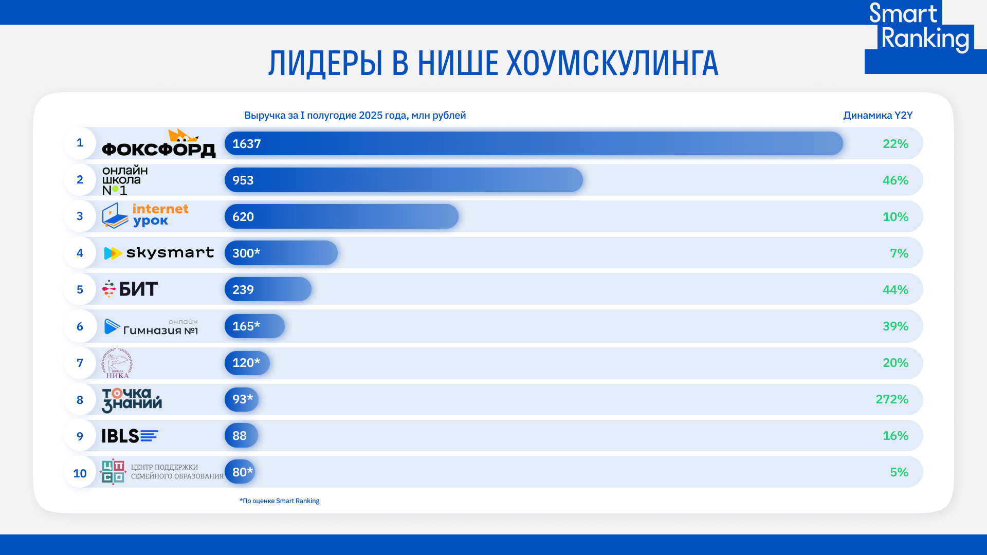 За I полугодие 2025 года, по оценке Smart Ranking, топ-25 компаний на рынке домашнего обучения заработали почти 4,6 млрд рублей — на 27% больше, чем годом ранее. Среди драйверов роста — гибридные форматы, мини-классы, геймификация и ИИ, а ключевые риски — демография и осложнившееся привлечение учеников.