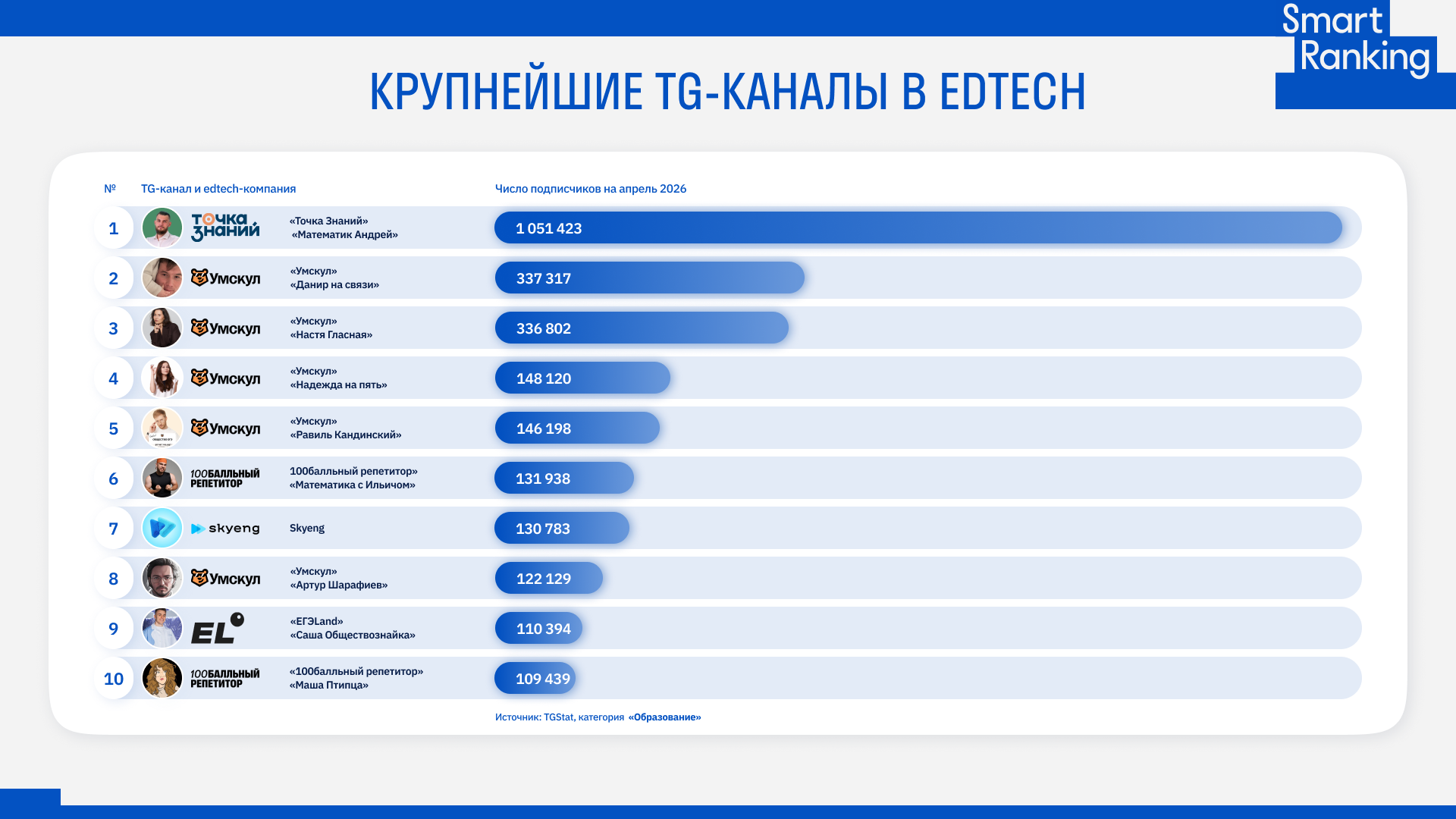 Среди крупнейших edtech-каналов с аудиторией более 1 млн подписчиков — «Математик Андрей», который ведет CEO «Точки Знаний» Андрей Шелудько. Его компания вошла в топ-15 самых быстрорастущих edtech-бизнесов и одним из драйверов роста в ней называли именно эффективную работу с соцсетями. Также в топе представлены аккаунты преподавателей из «Умскула», ЕГЭLand, «100балльного репетитора».