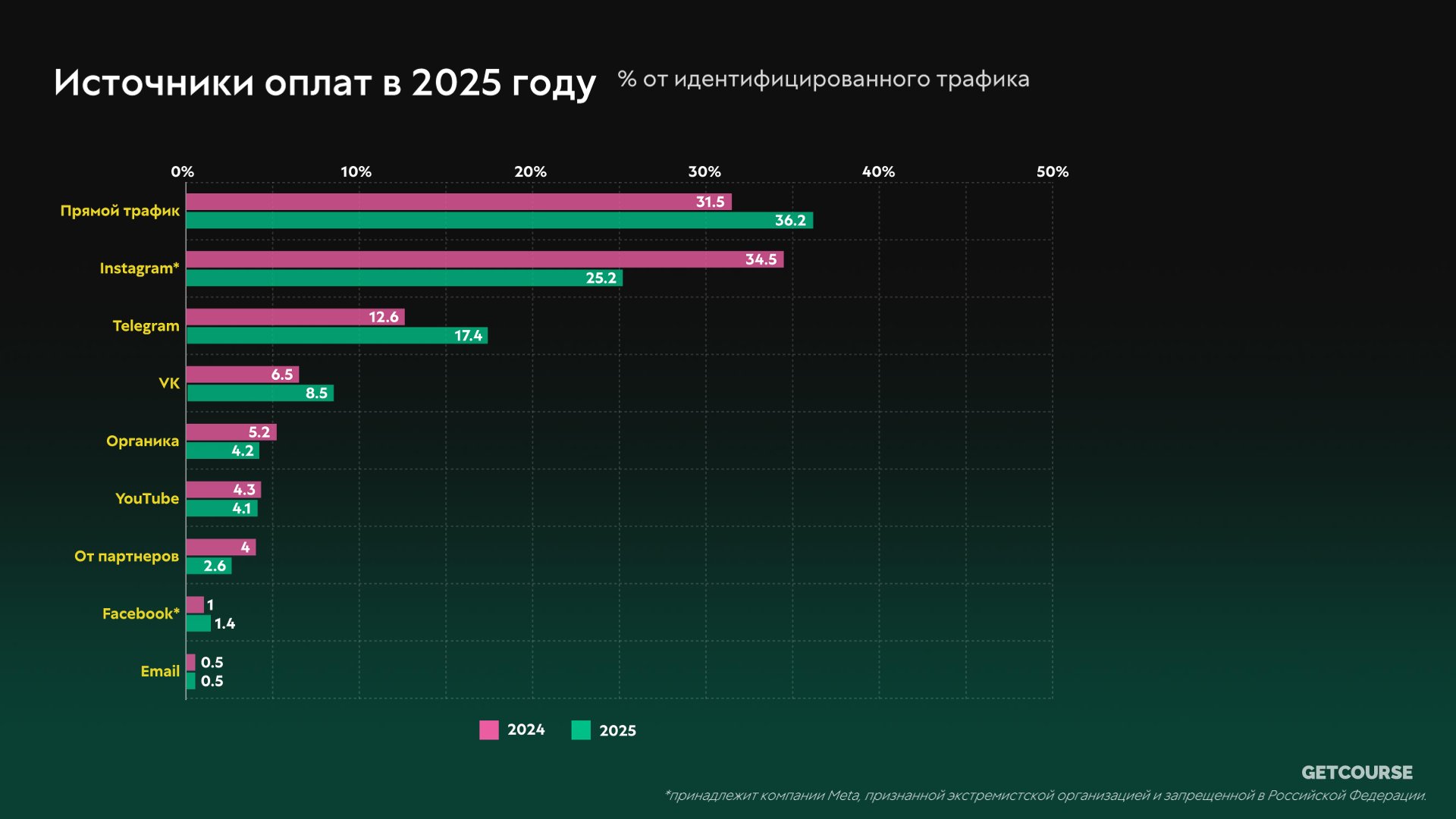 Edtech-бизнес активно пользовался площадкой — особенно после того, как заблокировали Instagram* и замедлили YouTube. В I полугодии 2025 года онлайн-школы нарастили выручку из Telegram на 55% год к году, доля мессенджера в общем сплите рекламных каналов удвоилась, показало совместное исследование GetCourse и Telega.in. Для инфобизнеса Telegram стал одним из самых быстрорастущих источников оплат: его доля выросла до 17,4% в 2025-м году против 12,6% в 2024-м.