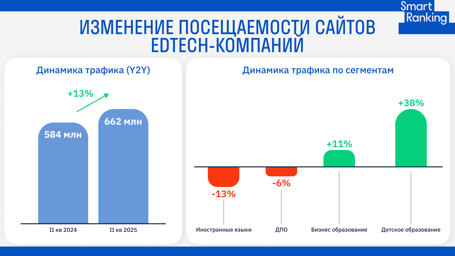 Анализ трафика сайтов 160 edtech-компаний из рейтинга Smart Ranking показал, что во II квартале 2025 года число визитов увеличилось на 13%. В основном это произошло за счет роста трафика в детском сегменте — он увеличился на 38%. Причем здесь самыми динамичными стали школы для подготовки к выпускным экзаменам: десять школ такой тематики из рейтинга нарастили трафик почти на 81%.